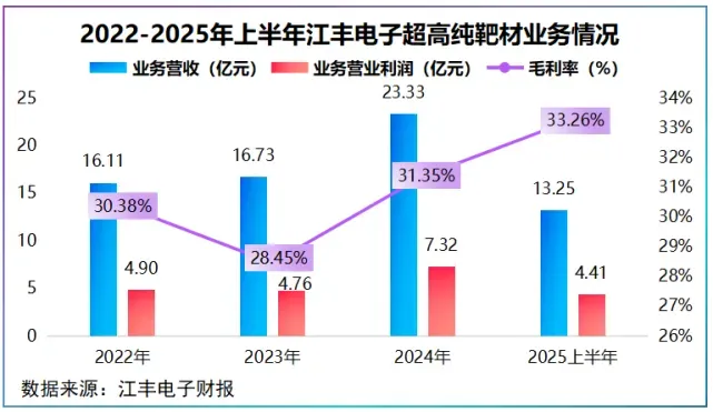 2025年上半年,公司先端存储芯片用高纯300mm硅靶实现稳定批量供货,超高纯靶材主营利润同比大增36.11%,毛利率同比提升约3个百分点,达33.26%