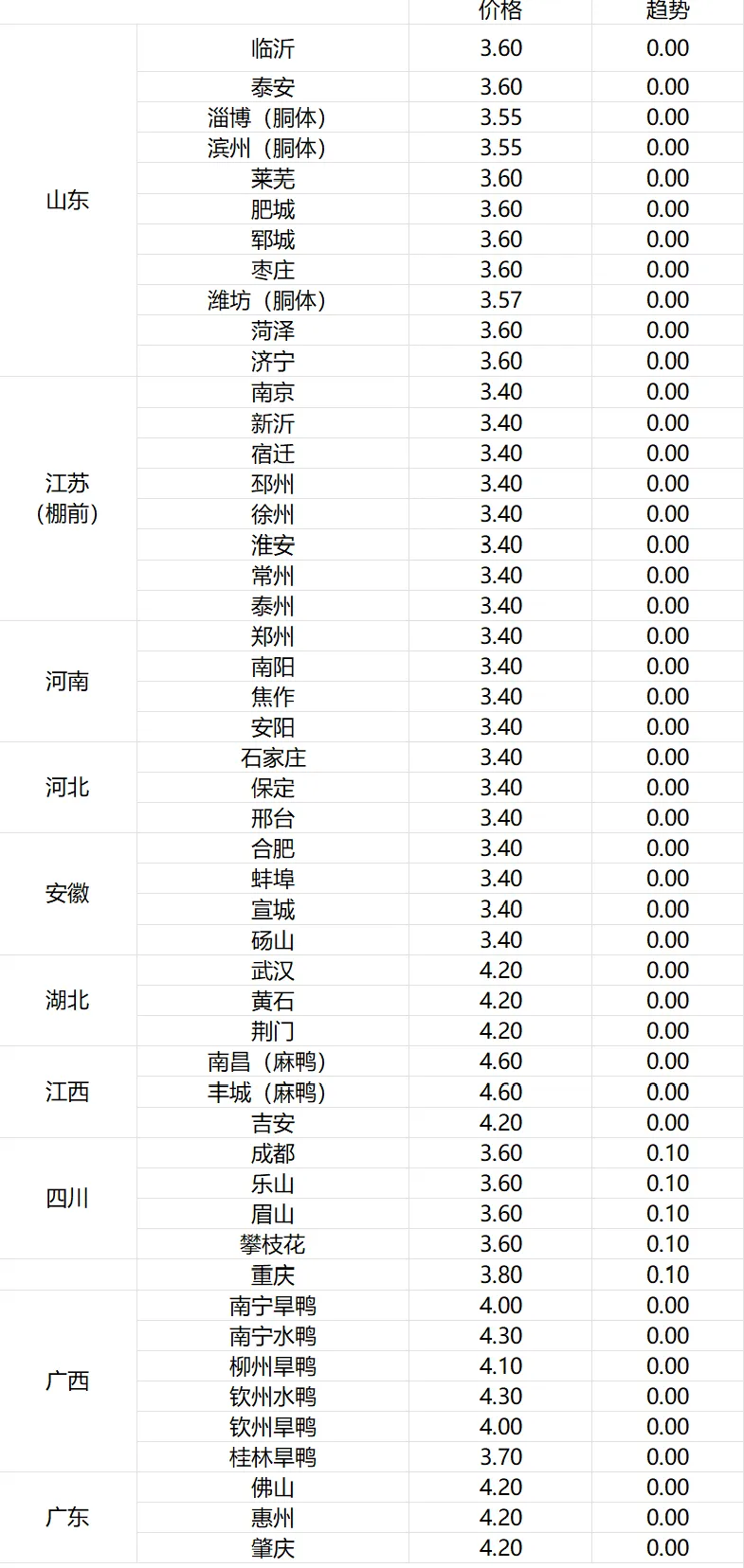 1、明日鸭苗(单位:元/羽)