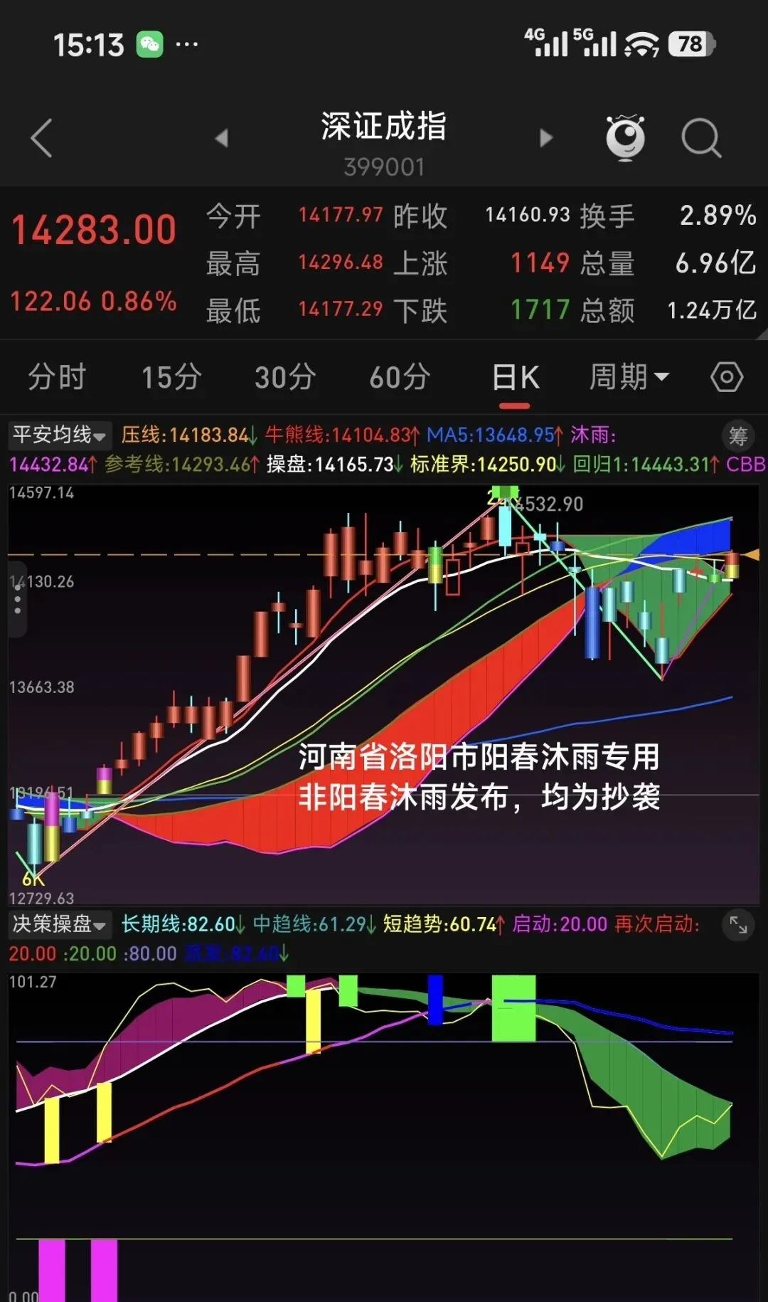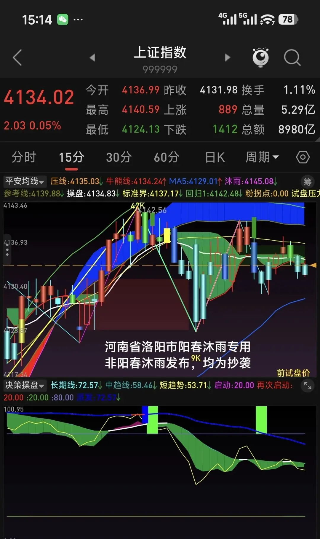 上证的15分钟级别,空头趋势非常明显。虽然近两天指数收盘价始终维持微红未跌,但指数在较小的区间震荡,已经形成了均线系统空头趋势,决策指标线持续向下运行。深创科指数虽然昨天运行了一笔15分钟级别上涨,目前均线和决策指标均保持多头趋势,但指数创了新高,决策指标长期线却没有创新高,15分钟级别存在高位顶背离,并且决策指标中短期线处在高位,15分钟级别的上涨不可持续。