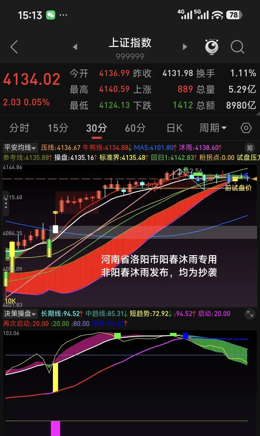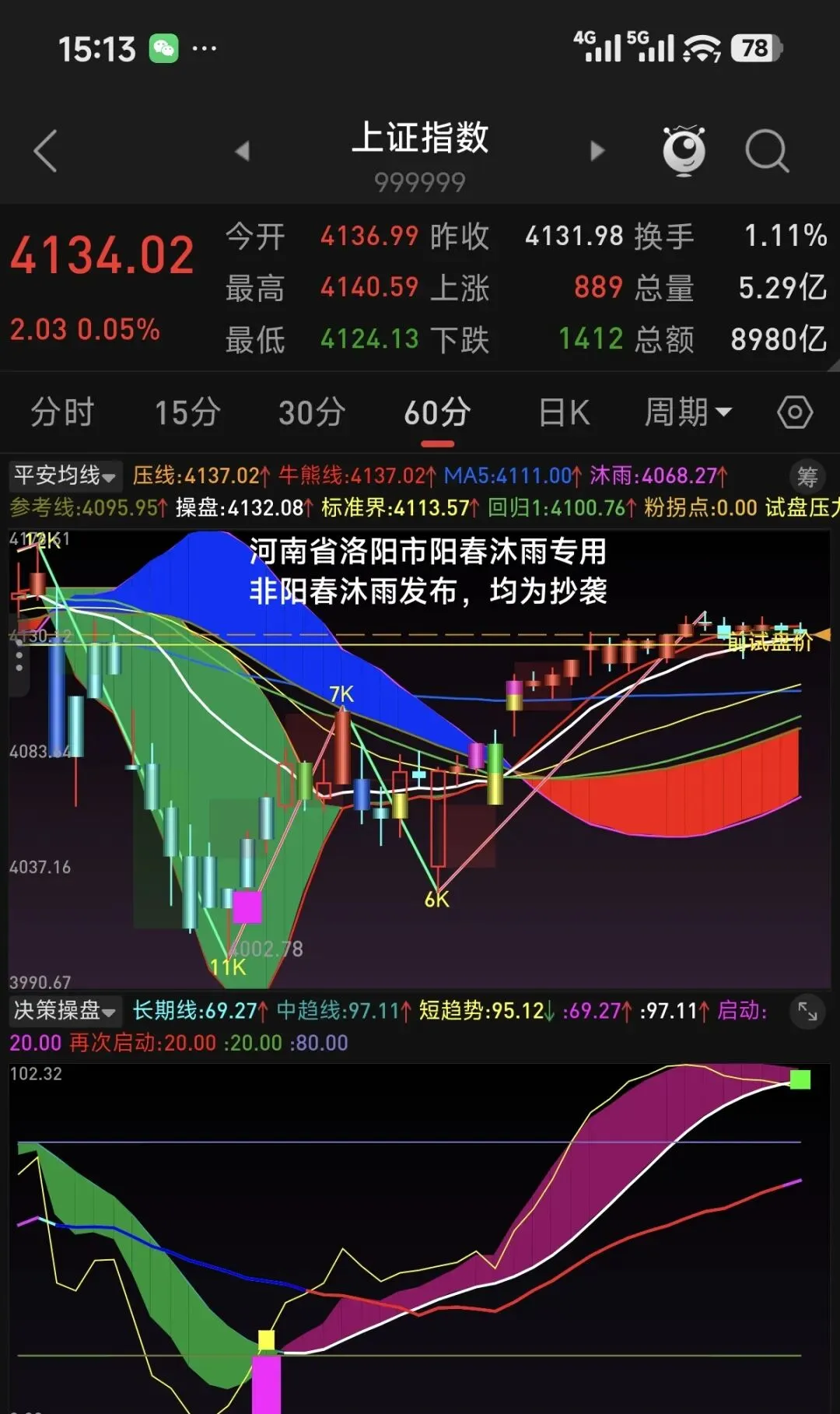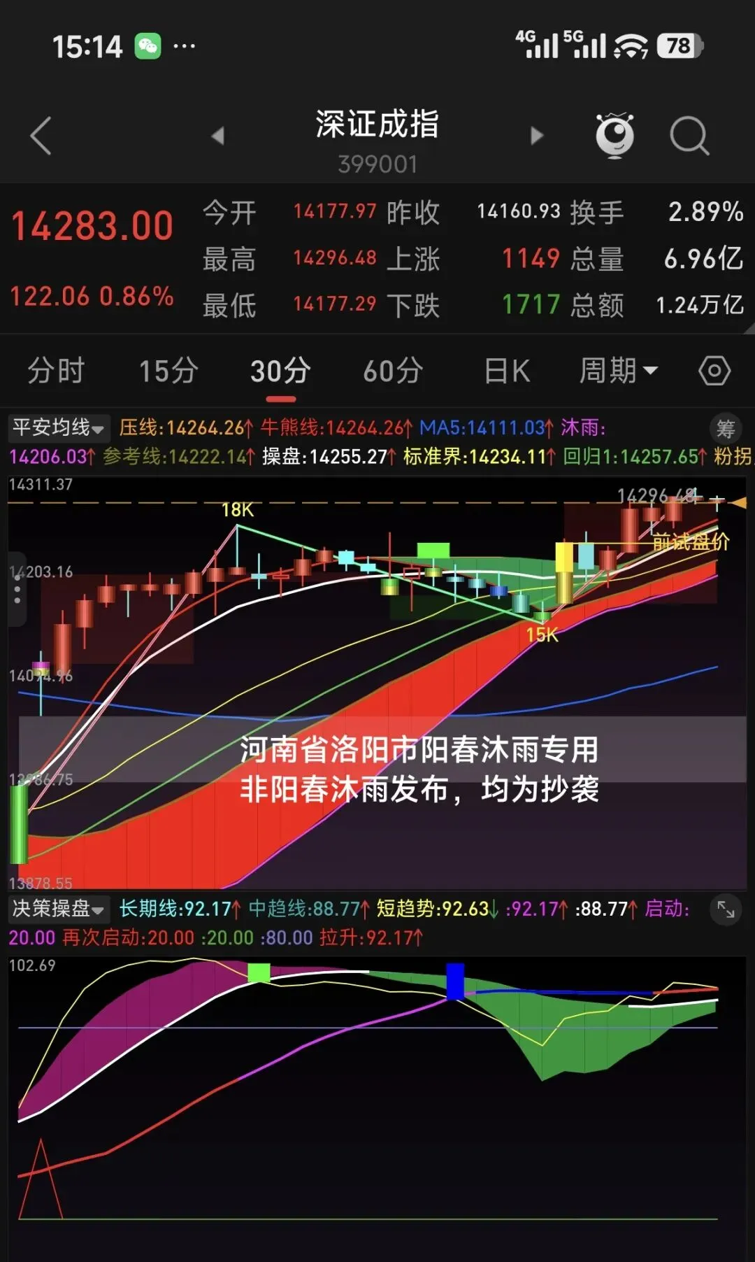 从60分钟级别看,均线和决策指标均为多头趋势。目前均线向上发散,指数距离长期线较远,决策指标中短期线在长期线上方运行,长期线处在中位偏上,上升趋势没有结束。自60分钟级别确认向上拐点以来,上证指数从低点算起已经运行了8天时间,深创科指数都已径运行了5天,今天将进入第6天。60分钟级别上涨何时结束主要取决于小级别的回调幅度。