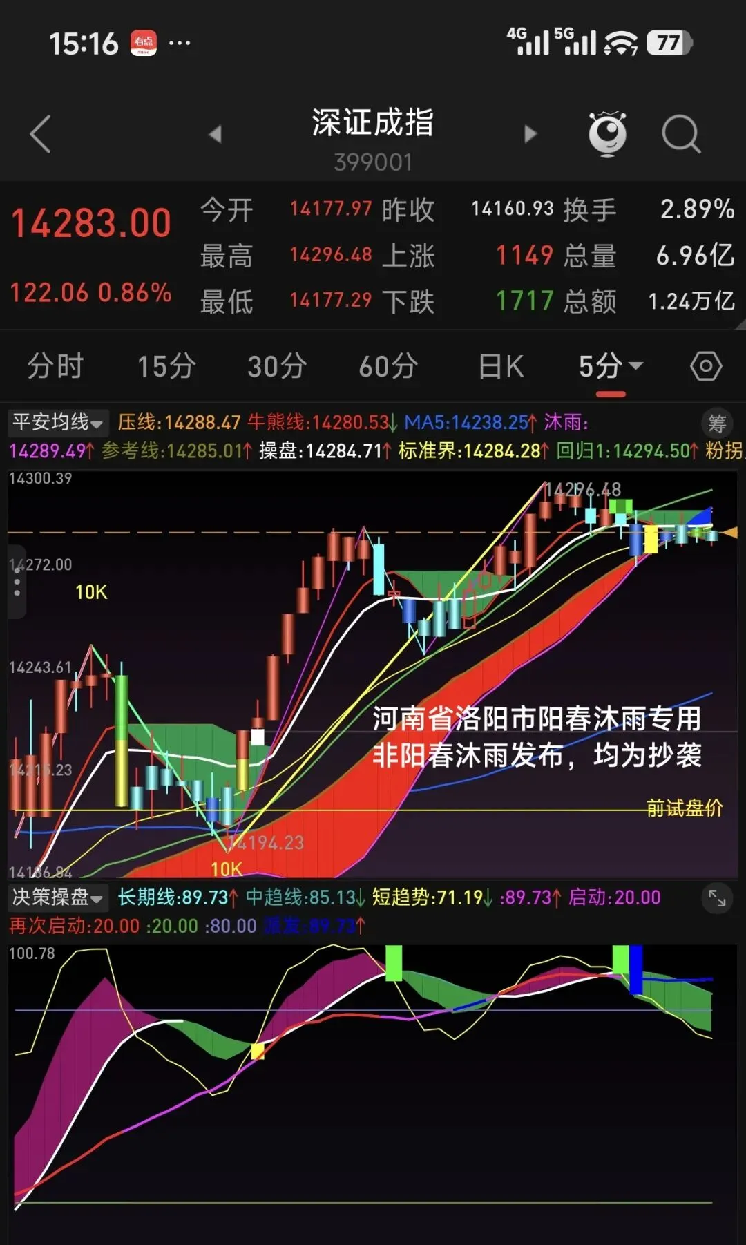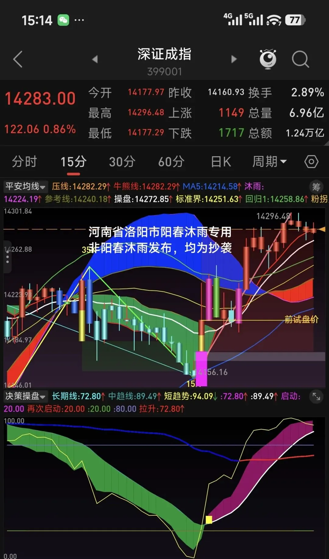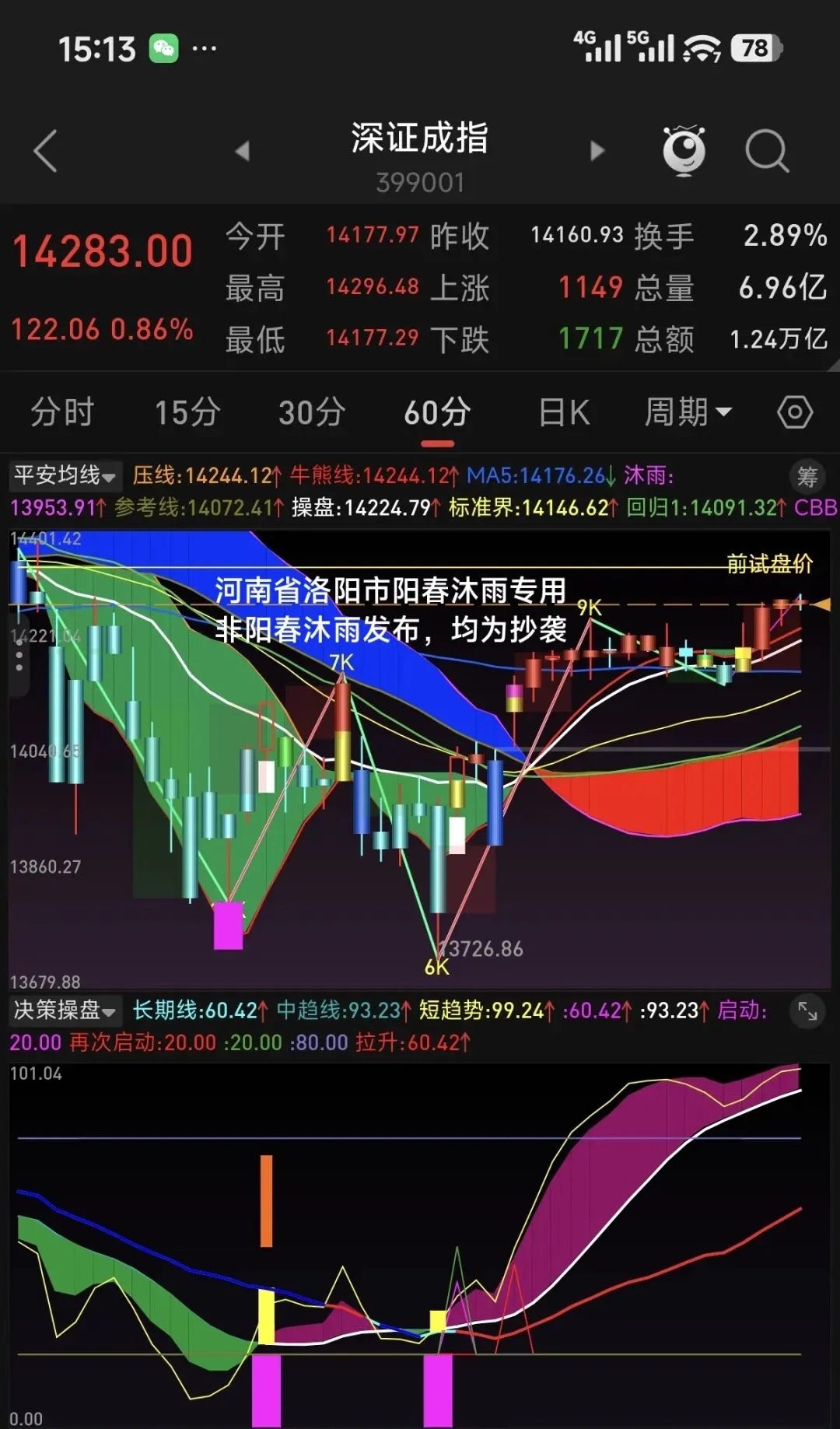 从60分钟级别看,均线和决策指标均为多头趋势。目前均线向上发散,指数距离长期线较远,决策指标中短期线在长期线上方运行,长期线处在中位偏上,上升趋势没有结束。自60分钟级别确认向上拐点以来,上证指数从低点算起已经运行了8天时间,深创科指数都已径运行了5天,今天将进入第6天。60分钟级别上涨何时结束主要取决于小级别的回调幅度。