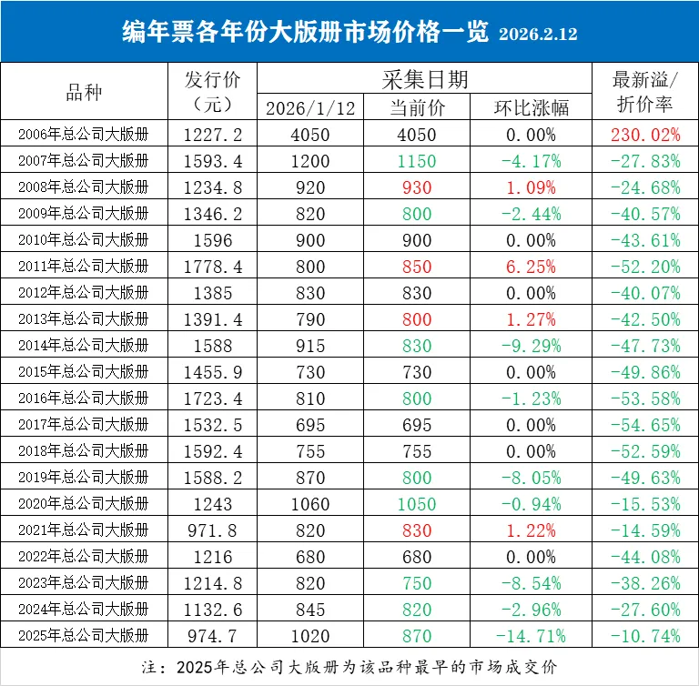 环比上期,20个年份的大版册取得4涨7平9跌,其中2025年大版册上期价格采用2月2日那天该品种的最后成交价。