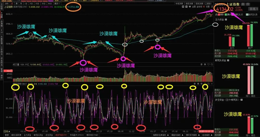技术分析:昨天两市成交额回落至2万亿出头,剔除量化交易后自然成交约1.5万亿,交投趋于谨慎。但结构性机会仍在——电子、半导体、小金属等板块活跃,与AI全产业链发力的政策信号高度共振。尤其液冷、算力服务器等细分领域,成为资金聚焦方向。沙漠雄鹰认为,沪深股指均收于所有均线之上,两市合计成交21418亿元环比增加;60分钟图显示,各股指均收于5小时均线附近,60分钟MACD指标均呈现金叉状态;从形态来看,尽管沪指结束连阳,但市场依然保持强势,沪深股指5日、10日均线出现金叉,前期较弱的创业板指,也完成对短周期技术指标的修复。值得注意的是,当下市场仍属于箱体回拉走势,虽然昨天成交量略有放大,但想要以此突破前期高点还是底气不足,后市仍需谨慎5日均线得失。综合来看,综合来看,2月春节红包行情仍在继续,受成交量萎缩影响,市场仍将保持轮动格局。