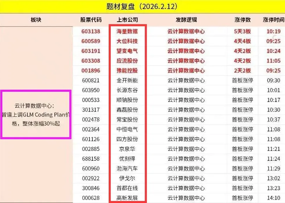 热点分析:国产大模型密集发布叠加优刻得提价消息双重刺激,算力租赁板块延续强势,其核心逻辑与有色板块几乎如出一辙,均是源于供不应求的格局,进而推动价格上涨。据市场预计,2026年国内AI算力需求同比将增长80%,而供给缺口更是达到40%以上,在这样的供需格局下,算力租赁龙头企业的业绩已无需担忧,例如600589大位科技。国家出台利好政策支持央企算力发展,只是板块上涨的一个催化因素,即便没有这一催化,短期多头趋势也难以逆转。毕竟能够主动喊出涨价,就意味着掌握了市场的强话语权,其基本面必然具备坚实支撑。回顾近期盘面,不难发现涨价题材成为市场香饽饽。从大宗商品有色金属到化工,从AI硬件产业链存储芯片到光纤,再到电子布,铜箔,再到算力租赁,液冷服务器,背后都离不开涨价的催化。因此,2026年涨价逻辑有望贯穿全年!