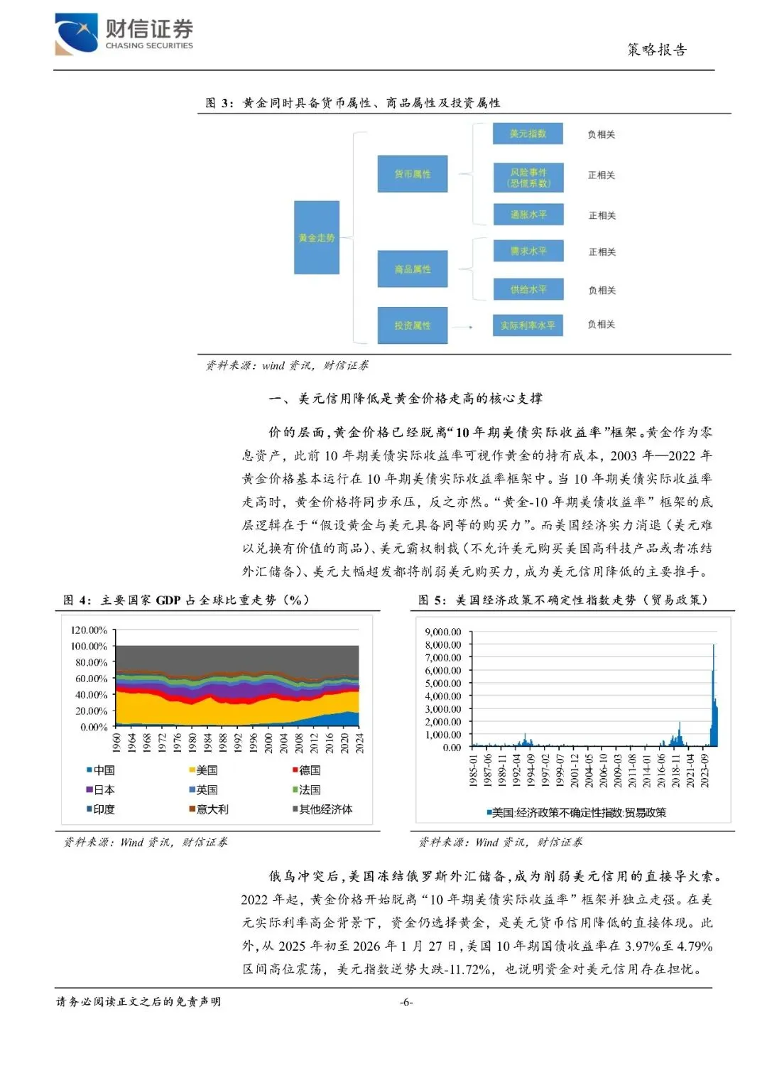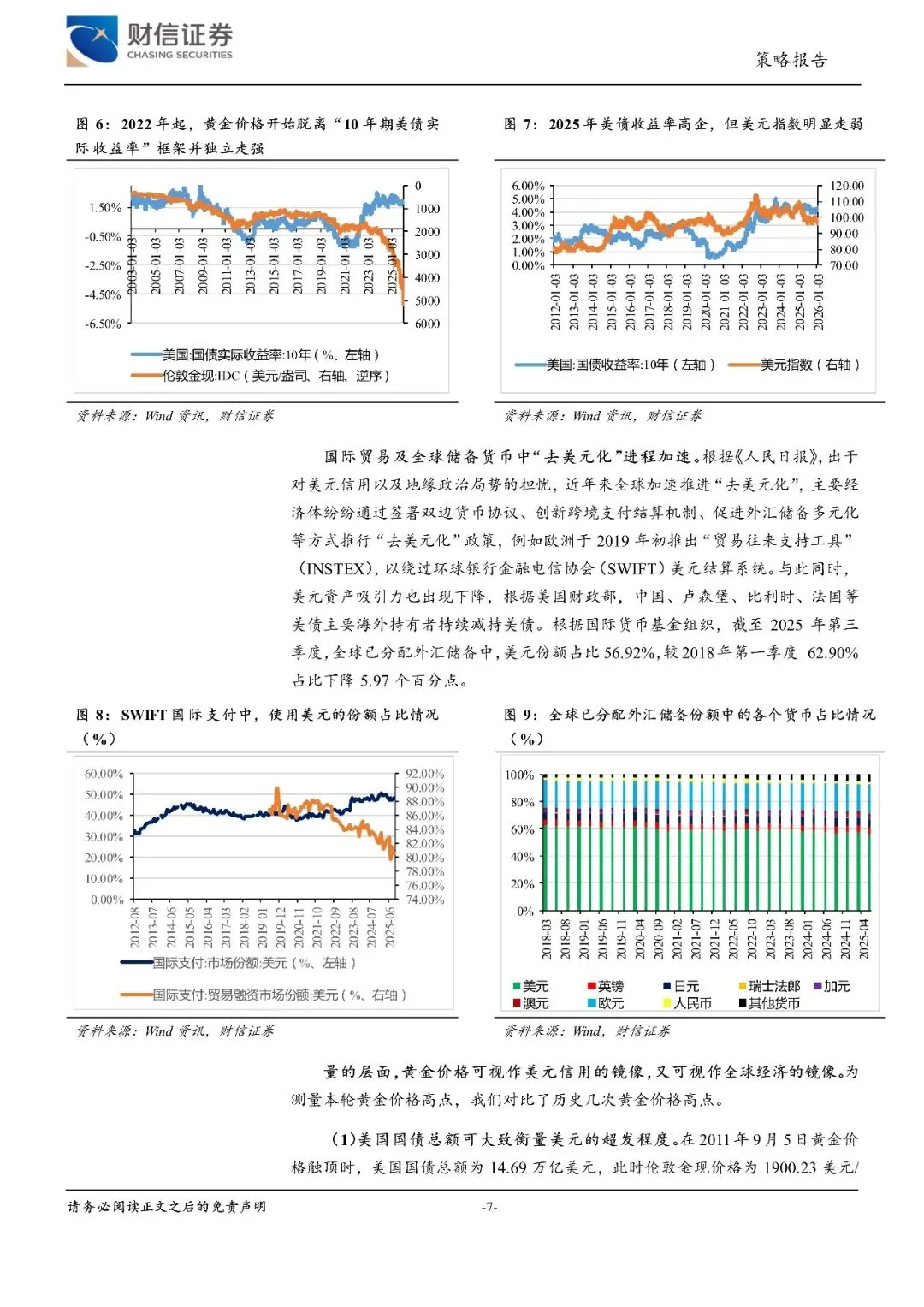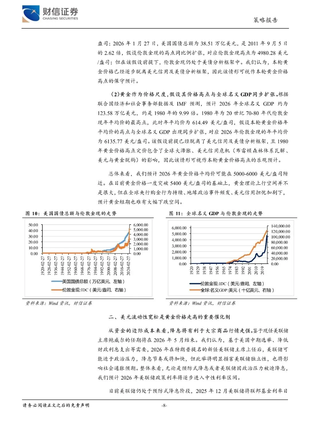 美元信用降低是本轮大宗商品涨价的核心支撑。如在美债分析框架内保守测算,对应伦敦金现高点为 4980.28美元/盎司;如脱离美债分析框架,假设黄金价格高点与全球名义 GDP 同步扩张,对应 2026 年伦敦金现的年平均价为 6135.77 美元/盎司。综合预计 2026 年黄金价格年平均价可能在5000-6000美元/盎司附近。需求端而言,国际政治集团对抗、局部热战、工业化转移或再工业化几乎是每一轮大宗商品大