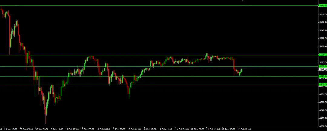 关注目前的短线反弹,若价格强势收回4980上方,则整体偏强看待,各位自行切换至短周期,按波段开仓四部曲参与。
