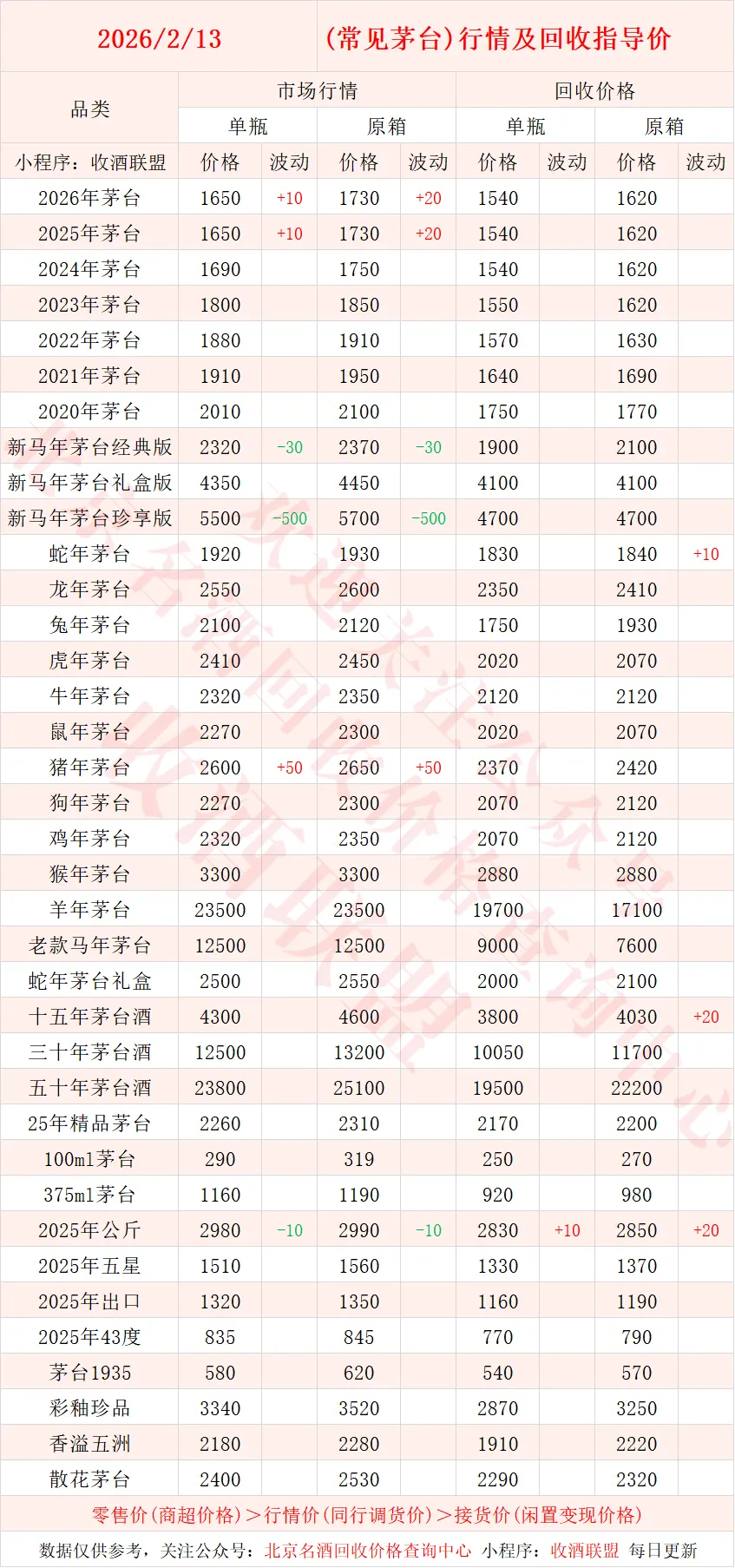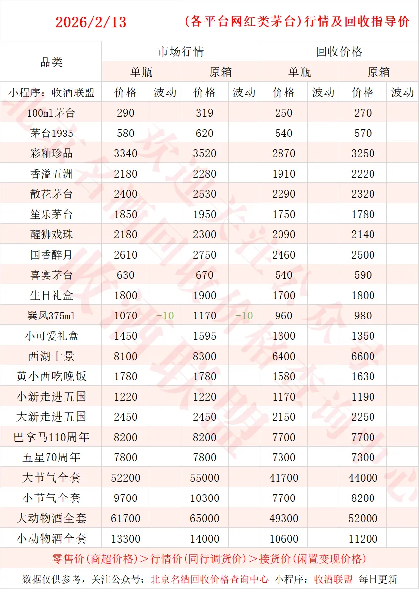 以下内容为,本公众号每日会及时更新的飞天茅台、生肖茅台、年份茅台,陈年茅台及不同毫升容量茅台的市场行情和回收报价;还包含五粮液、汾酒、剑南春、泸州老窖等国产名酒的行情及回收价,法国拉菲、木桐、玛歌等名庄红酒的回收报价,轩尼诗、马爹利、人头马等世界知名洋酒威士忌的回收参考价,每日整理不易,请点击关注支持。▪畅销类茅台行情及接货参考价▪