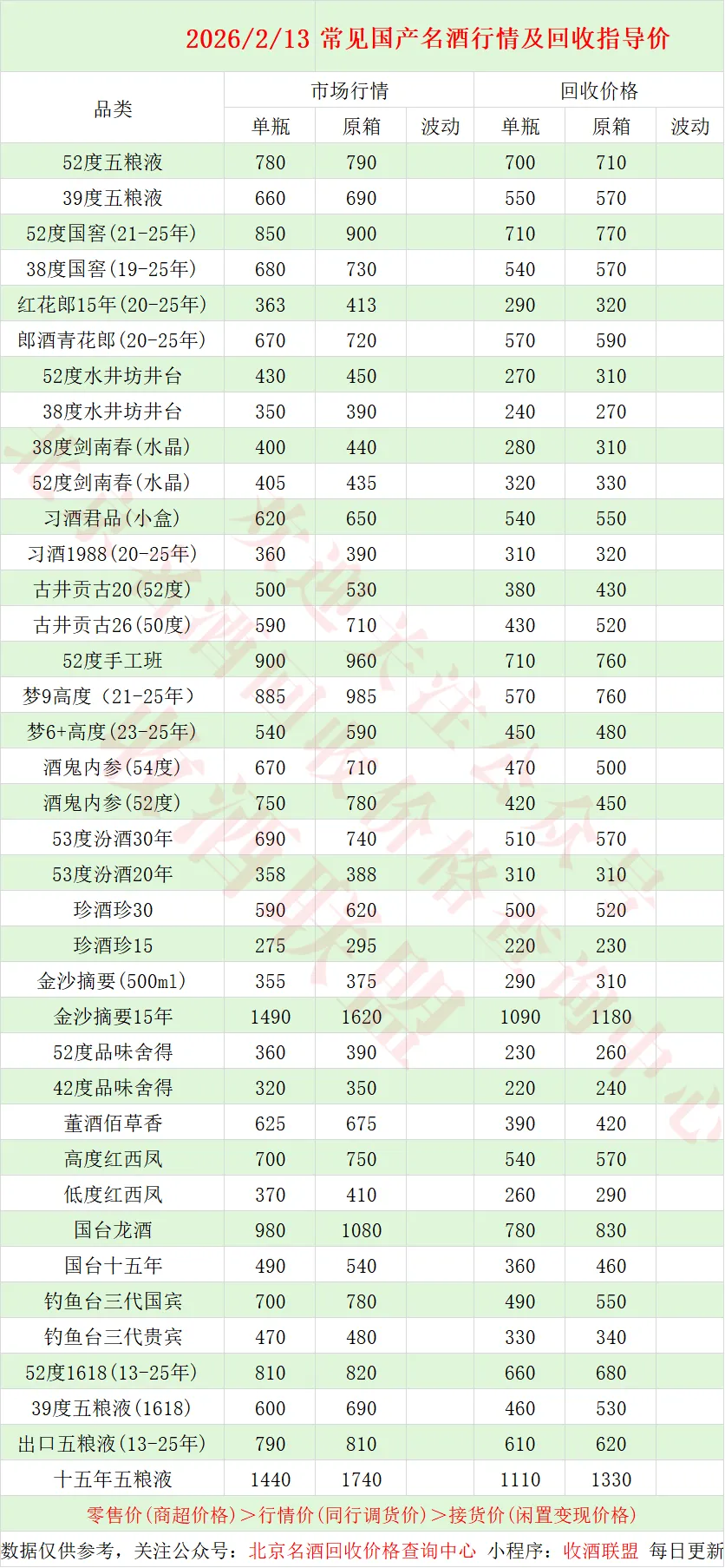 一般低于行情价,是面对消费者闲置名酒回收的价格,受外观品相、包装配件齐全、酒液位置、酒品二次销售难易程度的影响。