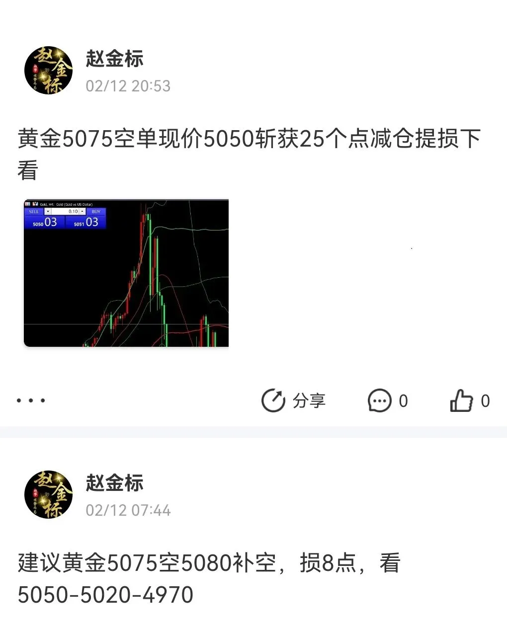 昨日操作回顾:黄金5075空单在5050获利25个点出局,最低给到5046;黄金第二波5075、5080空单在5050总计获利55个点;