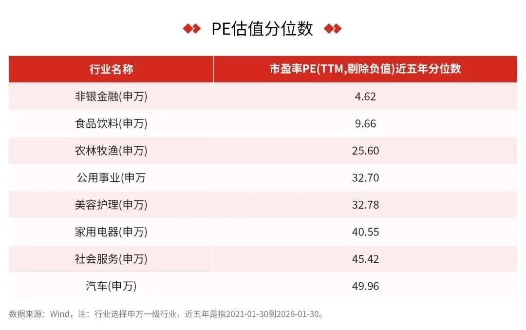 非银金融估值比过去五年95%的时间都低,食品饮料、家用电器等大消费板块也处于估值低位;