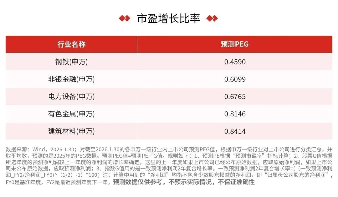 电力设备、有色金属等行业PEG小于1,成长价值未被充分定价,都是值得关注的洼地。