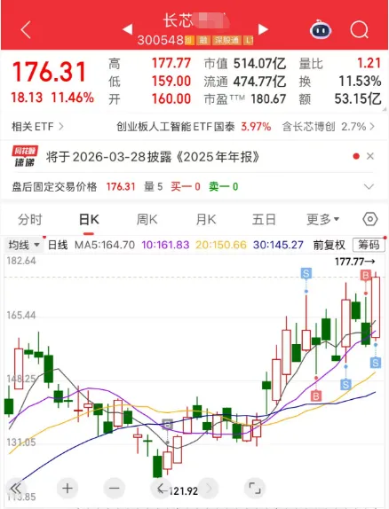 长芯BC今日太强势,甚至我都觉得快要超越天孚了,昨天小作文砸盘光模块,盘后中际XC澄清后,今天迎来超级大反弹,早上纪律性把昨日抄底仓位T出来,减半仓。今天出金日的压力预期,仓位是一定要减下来的,但是下午持续强势,创新高后站住了175以上是十分超预期的,看明天量化是否砸盘,砸到心理价位会再次接回来,最近长芯BC做大T真是太舒服了。