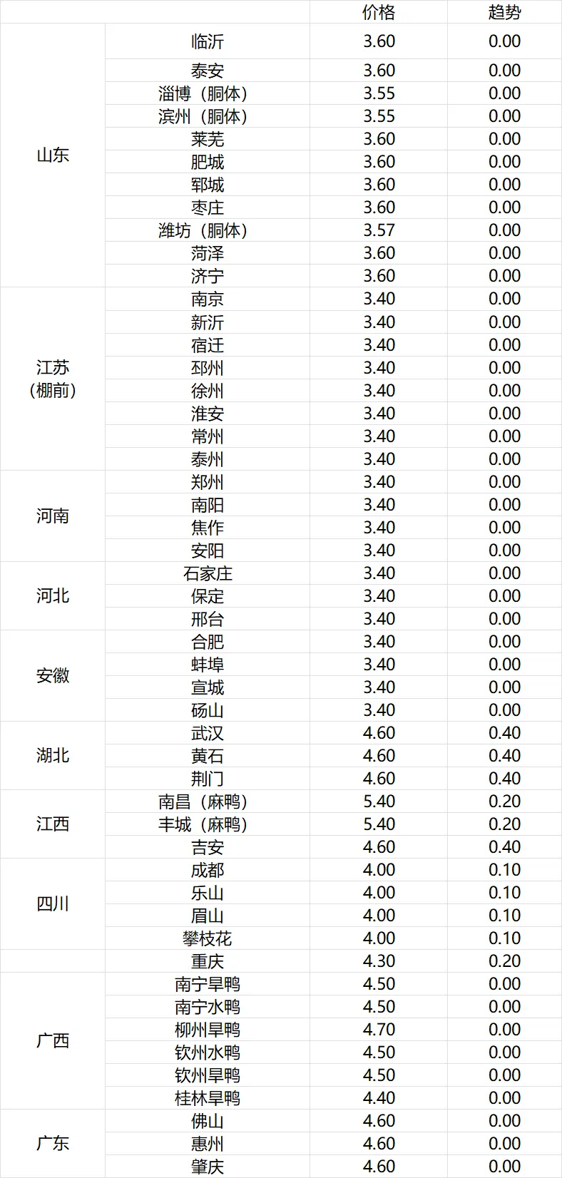 【麻鸭】广东2.0,广西1.9,江西1.9,