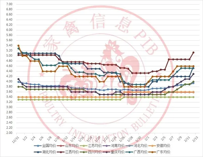 2025年12月31日-2026年2月13日主流地区白羽鸭毛鸭均价走势图