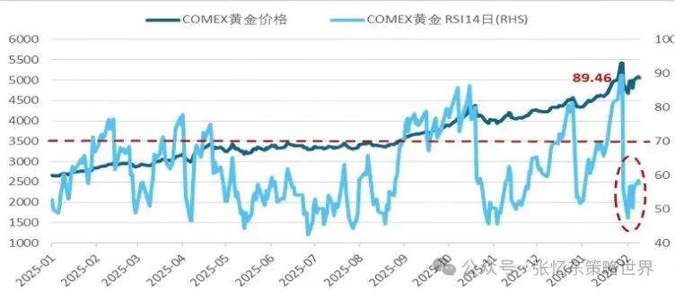 张忆东指出,前期COMEX黄金期货RSI指标一度升至89.46超买高位;