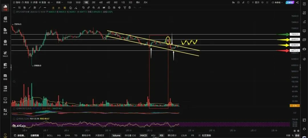当下的大饼又准备突破旗形,突破旗形66585的阻力同样会被突破那就又会重新回到66585-68400这个区间继续走震荡。各位同学你就记住大饼突破不了68400涨不起来,只有突破68400才能向上看更高的位置,下方64771跌破会扩大跌幅,上不去66585就会走66585-64771的盘整,就看大饼是选择去上方盘整还是选择在下方震荡,去上方盘整还有反弹的机会,在下方震荡扩大跌幅的概率会被提升。