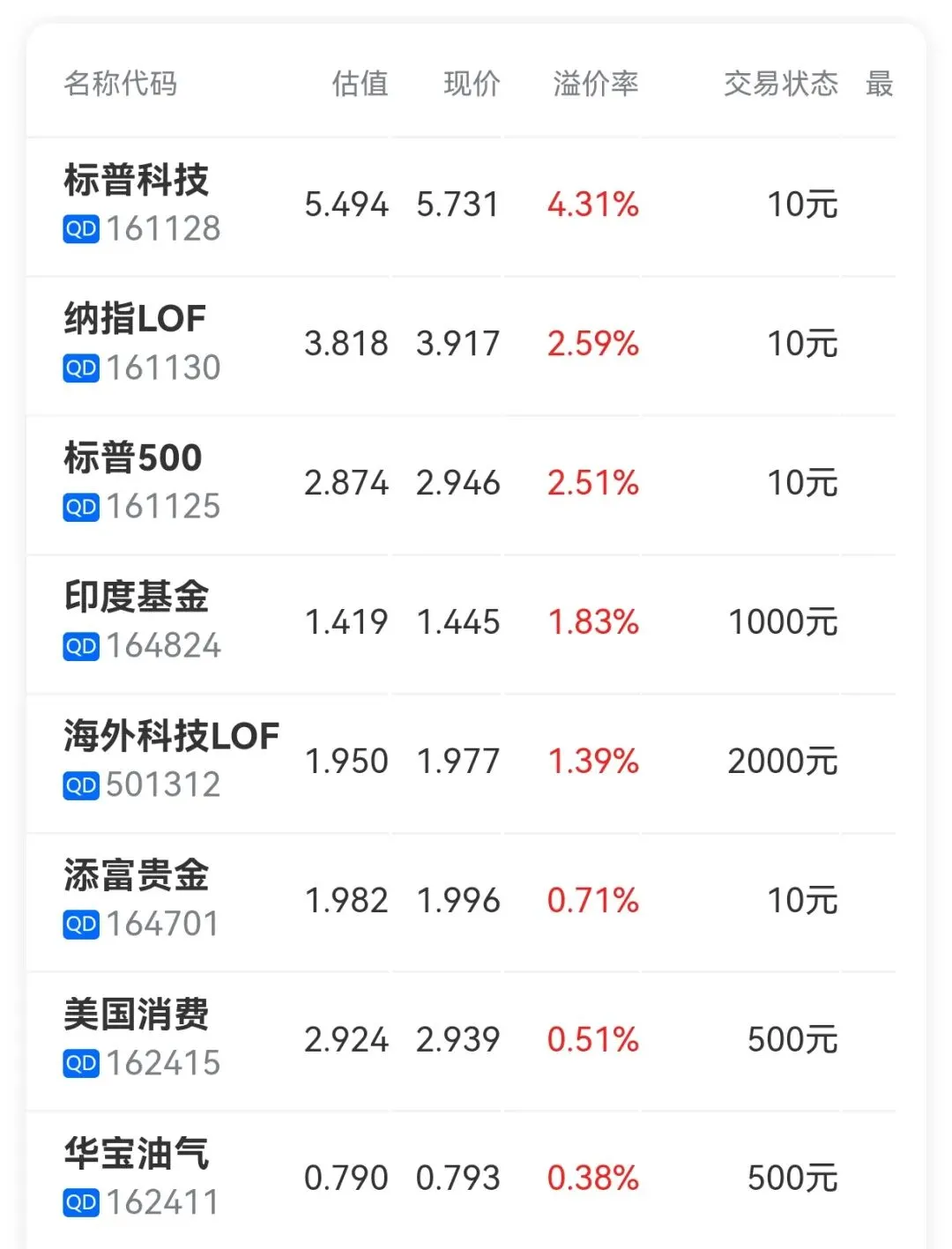 海外科技501312溢价率1.39%,限额2000,场内一拖二,今天不申购。华宝油气162411目前溢价率是0.38%,可以一拖六,限购500,今天不发车。年前就这样了,没什么大行情,大家安安心心过年吧,来年赚个盆满钵满,在此提前祝大家新年快乐,马年大吉!
