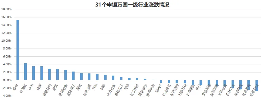 近五个交易日31个申万一级行业板块多数上涨。其中综合、计算机、电子涨幅居前,纺织服饰、食品饮料、美容护理跌幅居前。
