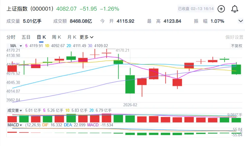 本周A股呈现“震荡回落、缩量调整”态势,全周围绕春节休市预期展开,政策端再融资优化政策落地释放利好,但未能扭转节前资金离场态势,指数整体承压,板块分化聚焦科技、消费领域。指数层面,结合同花顺权威数据,上证指数周一(2.9)开盘4103.54点,受再融资政策利好冲高至4123.16点,随后持续震荡回落,周五(2.13)收盘4082.07点,全周累计下跌0.99%,波动区间4079.77-4142.56点;深成指周一开盘14115.14点,周五收盘14100.19点,全周微跌0.06%,波动区间14060.67-14296.48点;沪深300指数周一开盘4693.67点,周五收盘4660.41点,全周下跌0.82%,波动区间4658.40-4732.09点,权重股走势弱于中小盘股,电子、食品饮料板块表现相对强势。
