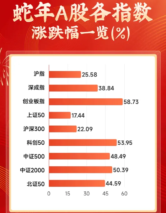 但从整个蛇年来看,A股的表现还是不错的,指数方面,累计涨幅如下: