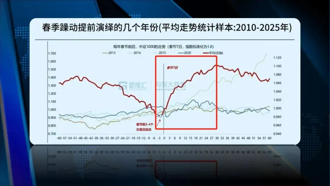 说完了节后开局的话题,我们再来看看中期趋势:最近15年,以中证1000为例,春节之后上涨行情平均能持续30个交易日左右,指数涨幅在10%以上。历史数据看,春季行情至少能看涨1个多月,现场两位嘉宾对今年的春季行情能看到多高多远?于尧认为春节后上涨概率高,中小票弹性大;支撑看5月均线,压力看通道上沿;