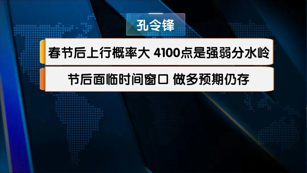 孔令锋认为春节后上行概率大,4100点是强弱分水岭。节后面临时间窗口,做多预期仍存。