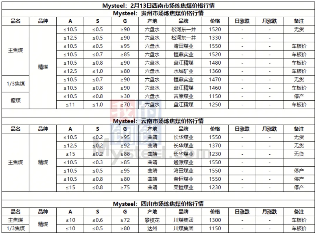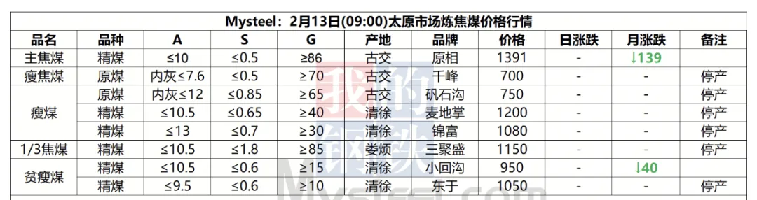 13日太原市场炼焦煤价格偏弱运行。供应方面,本周开始区域内煤矿陆续进入春节放假周期,国营煤矿放假计划普遍为3-7天;现钢厂高炉开工相对高位,铁水产量同比高位,焦炭刚性需求支撑较好,后期需持续关注焦煤走势、钢材价格走势。综合来看,预计短期内太原市场炼焦煤价格震荡偏弱运行。