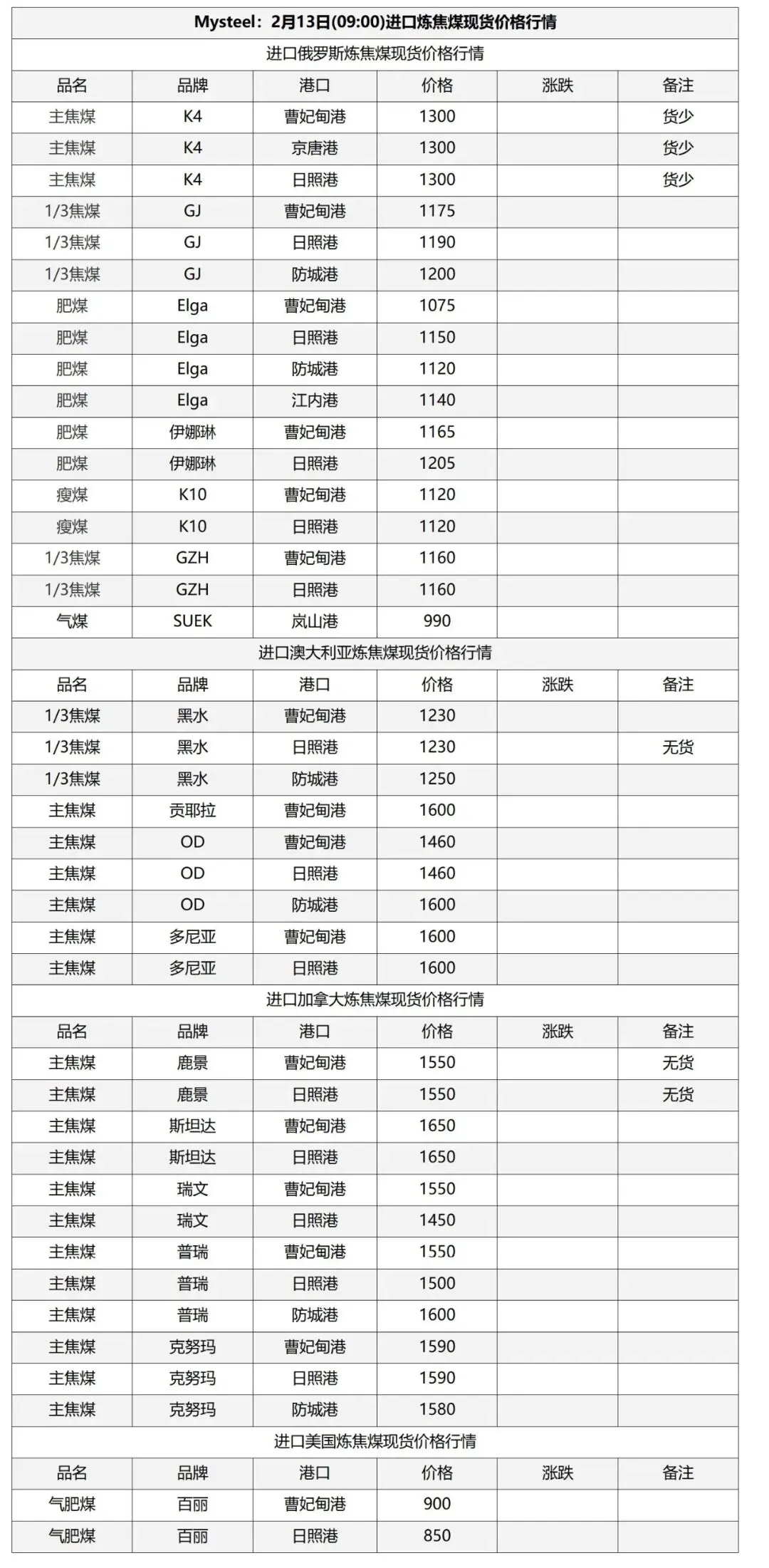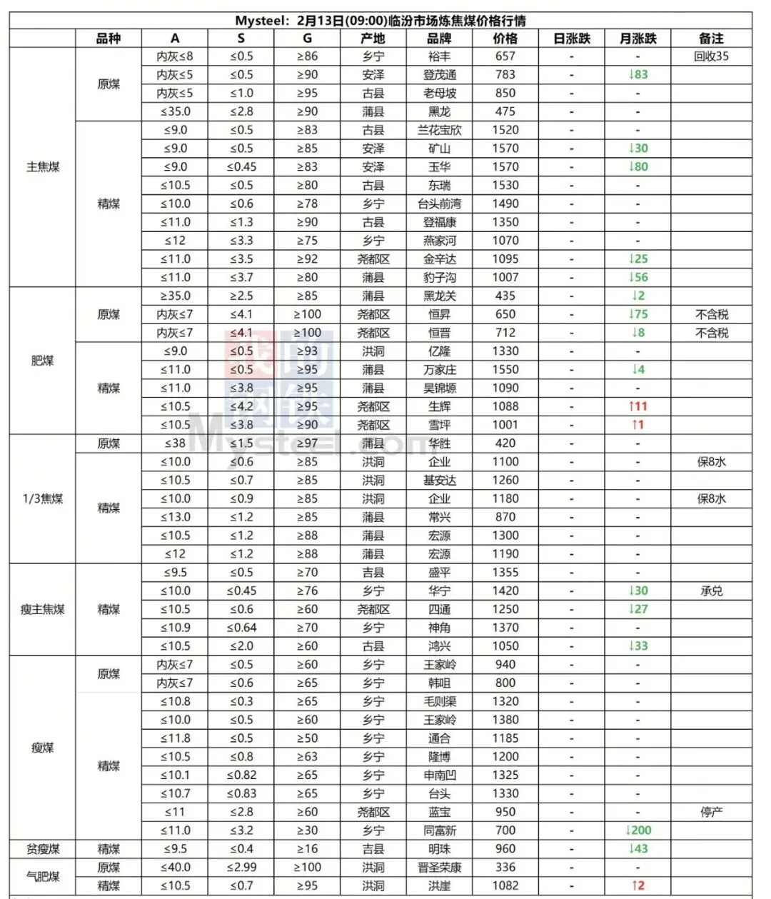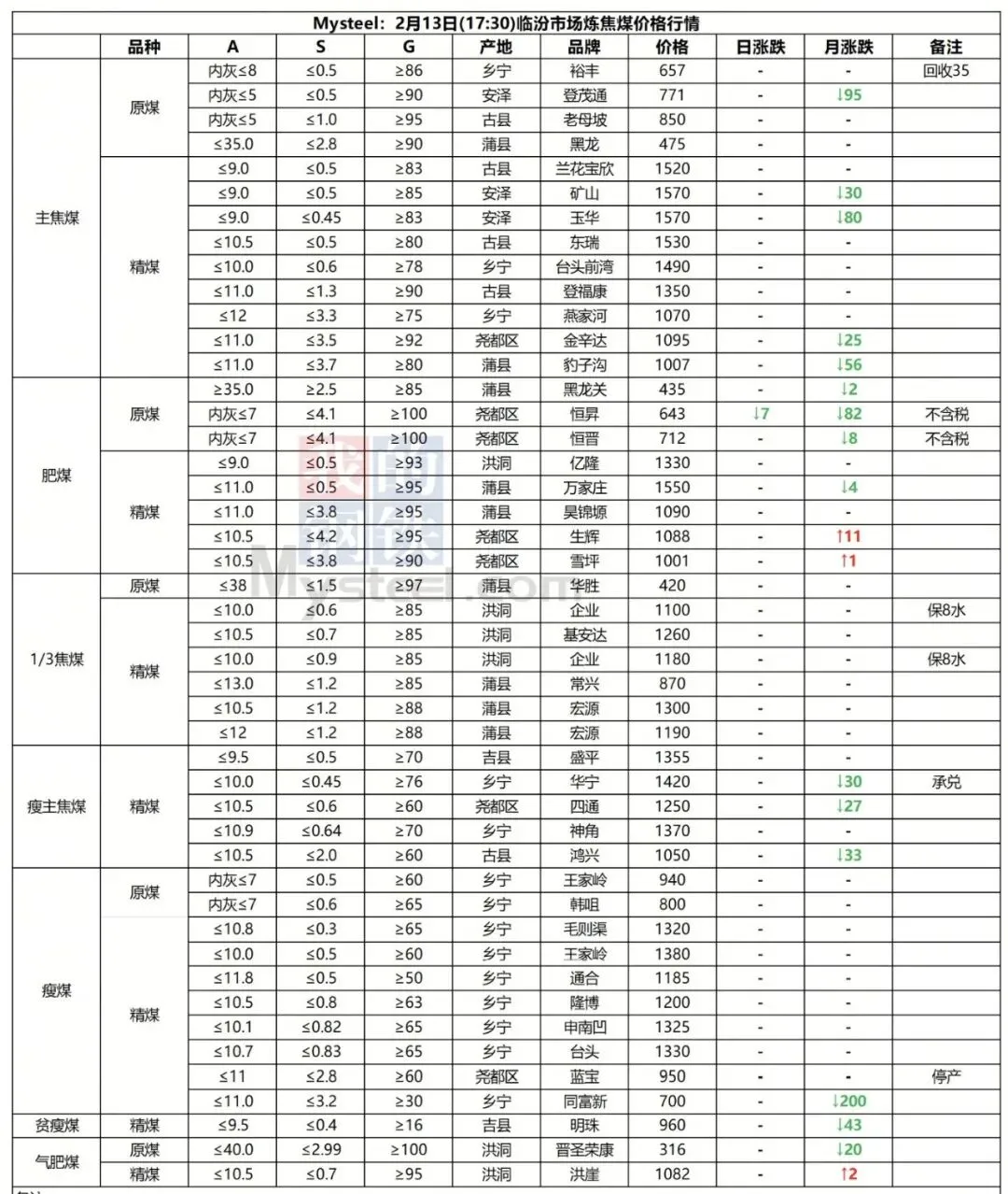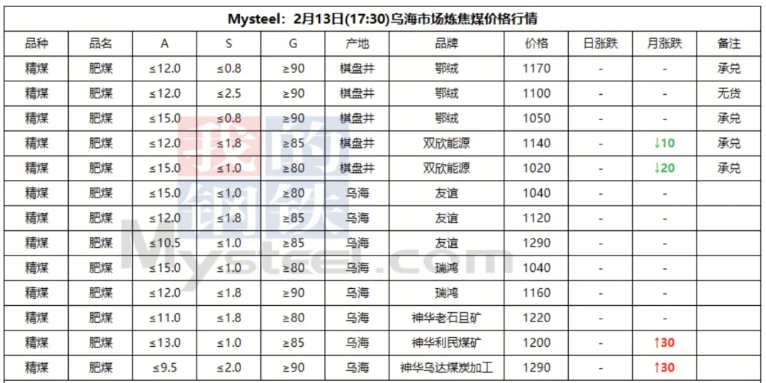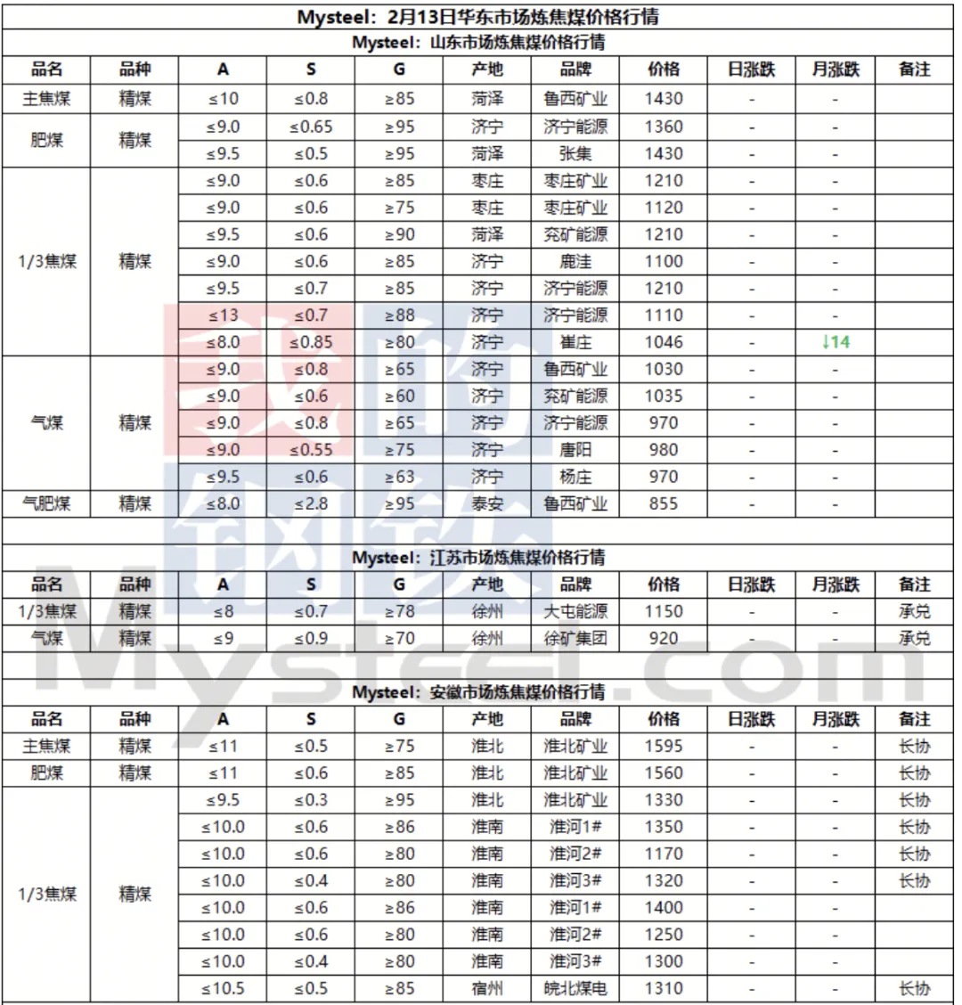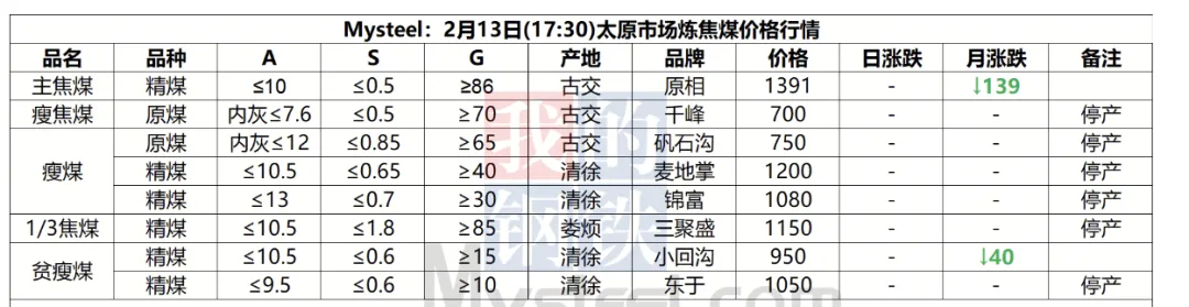 13日临汾市场炼焦煤价格偏弱运行。供应方面,本周开始区域内煤矿陆续进入春节放假周期,国营煤矿放假计划普遍为3-7天;市场成交方面,当前洗煤厂及贸易商等中间环节也多进入放假周期,出货均多以长协兑现为主;需求方面,目前多数下游企业焦煤冬储补库基本结束,后续需求端整体采购量或将继续下行,加之焦钢企业盈利水平一般,总体下游对原料煤的价格支撑偏弱。综合来看,预计短期内临汾市场炼焦煤价格震荡偏弱运行。综合来看,预计短期内临汾市场炼焦煤价格震荡偏弱运行。
