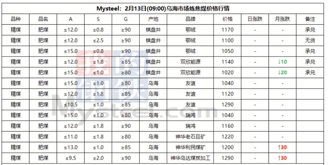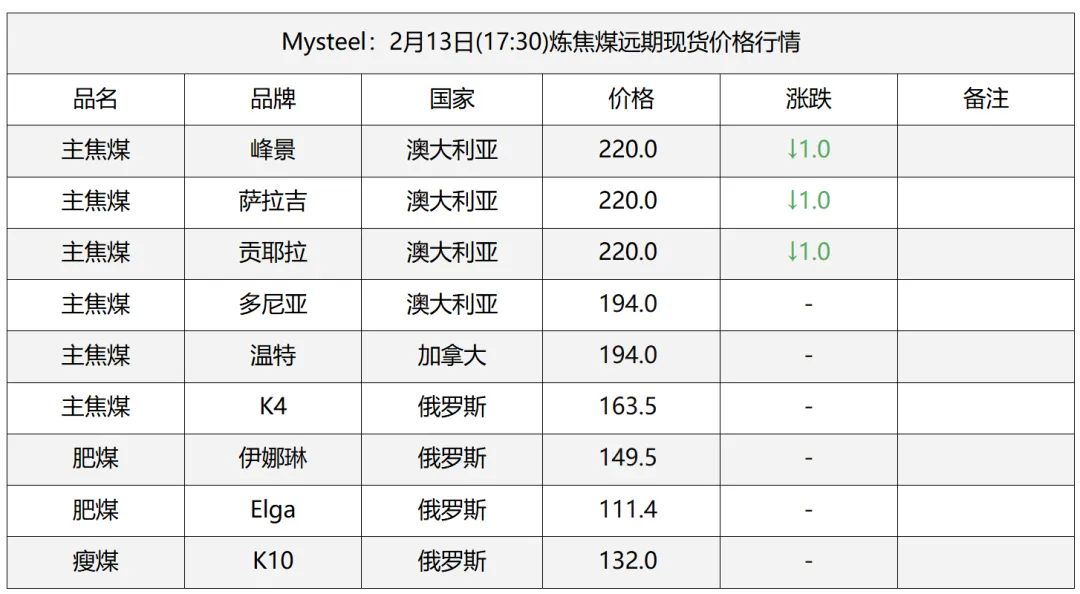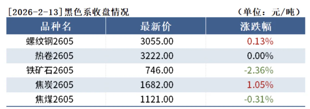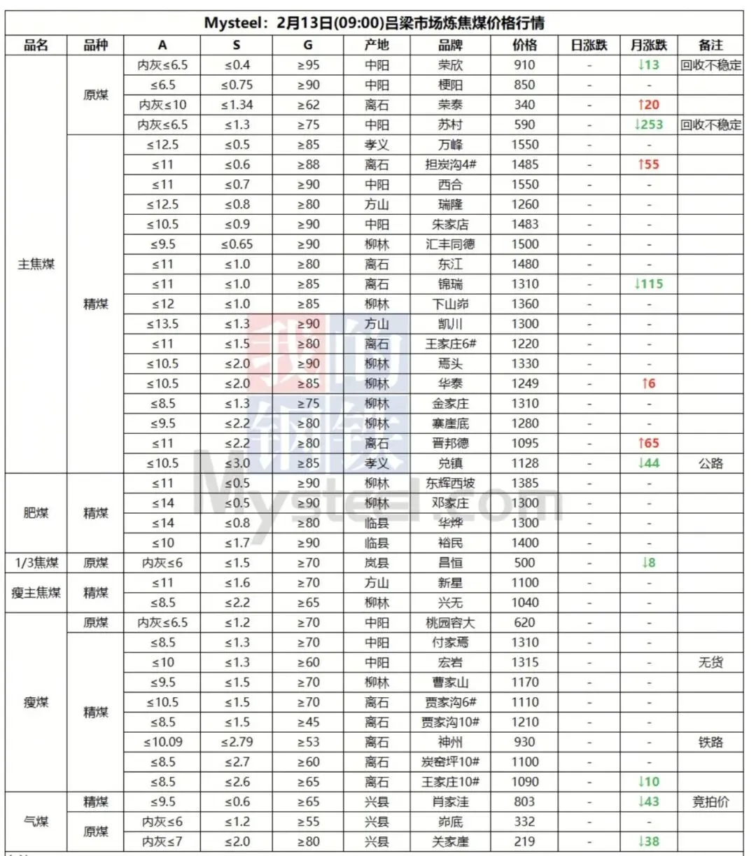 13日吕梁市场炼焦煤价格震荡运行。随着春节临近,主产区煤矿陆续进入放假阶段,煤炭供应呈现阶段性收紧。与此同时,焦钢企业冬储补库接近完成,市场交投氛围逐步转淡。尽管近期下游新增采购订单减少,但由于煤矿停产在即,焦企仍积极提运前期订单,带动坑口库存小幅去化。本周以来,部分煤矿已开始停产放假,炼焦煤产量出现回落。需求方面,目前多数焦企生产节奏总体保持平稳。钢厂方面,由于今年钢材销售整体偏弱,叠加铁水产量增长空间有限,预计后期五大钢材总产量难以显著提升,供给端回升压力不大。随着春节临近,钢材基本面走弱压力或将进一步显现;但短期内,受商品共振及宏观情绪支撑,钢价短期内或呈现震荡运行。