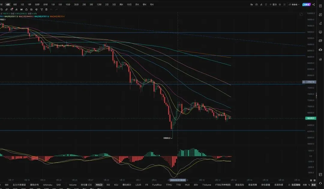 4小时周期来看,价格在下轨附近获得支撑并触发反弹走势,当前正向上测试中轨压力,布林带呈现缩口走平态势,短期均线呈现小幅向上拐头迹象,MACD快慢线形成金叉向上发散,对应量能出现温和放量,KDJ指标同步金叉向上运行,VR指标则在90数值附近维持整理,整体而言,价格虽在支撑位出现企稳反弹信号,但上方阻力压制依旧显著,4小时上轨与60日均线构成短期关键压力区间,同时DIF与DEA双线仍运行于零轴下方,市场整体趋势仍处于空头结构当中,不过MACD柱线已由负值转为正值1.47,DIF线上穿DEA形成金叉,预示短线存在技术性反弹修复需求。