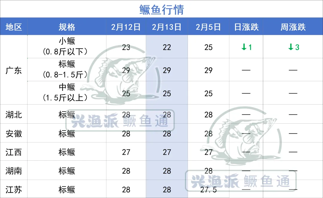 2月13日,广东小鳜跌1元/斤