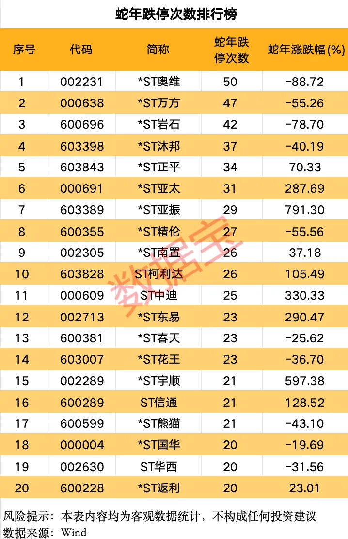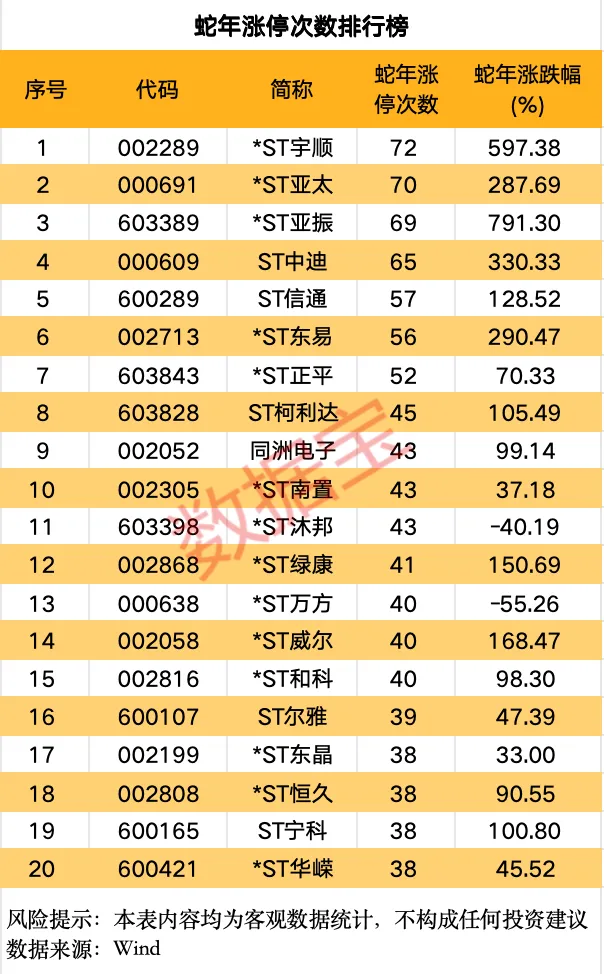 据数据宝统计,566股全年收获10次及以上涨停,70股经历10次及以上跌停。其中,*ST宇顺、*ST亚太、*ST亚振分别以72次、70次、69次涨停拿下涨停榜三甲;*ST奥维、*ST万方、*ST岩石分别跌停50次、47次、42次,位处跌停榜前列。