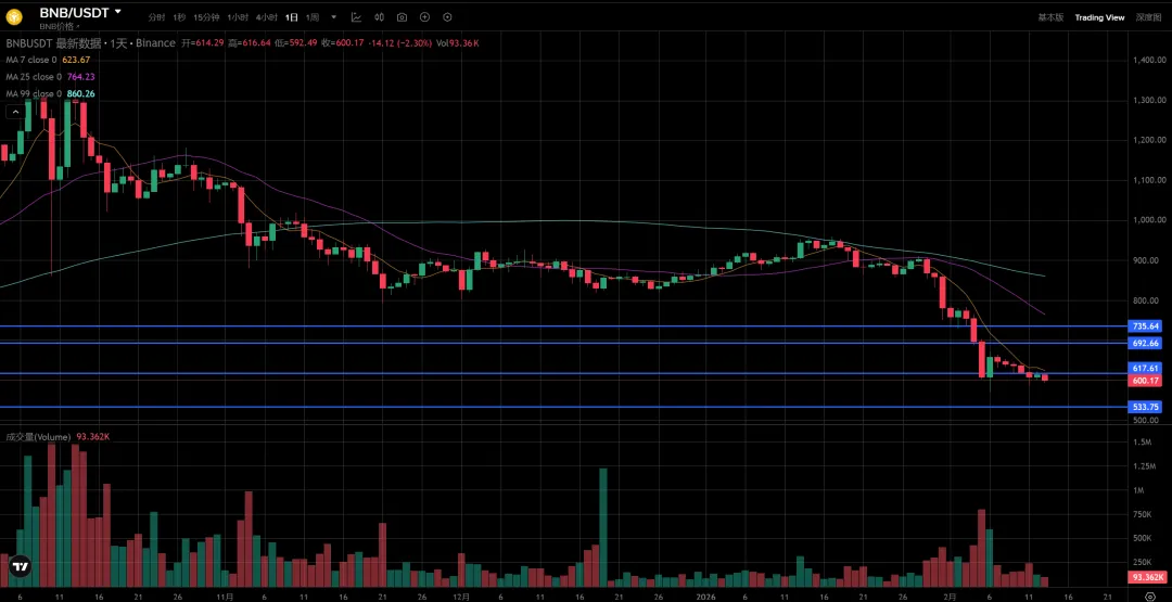 BNB破了600,会继续向下到533附近寻求支撑。这个走势是向下的趋势,耐心等待企稳。