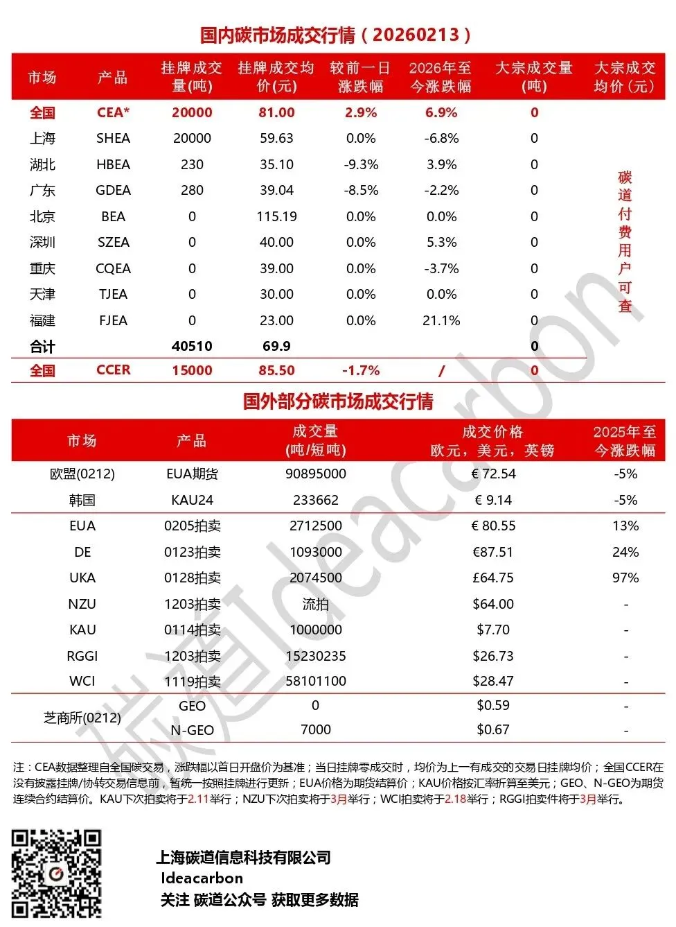 (CEA周报)全国碳市场每周综合价格行情2026.02.09-2026.02.13