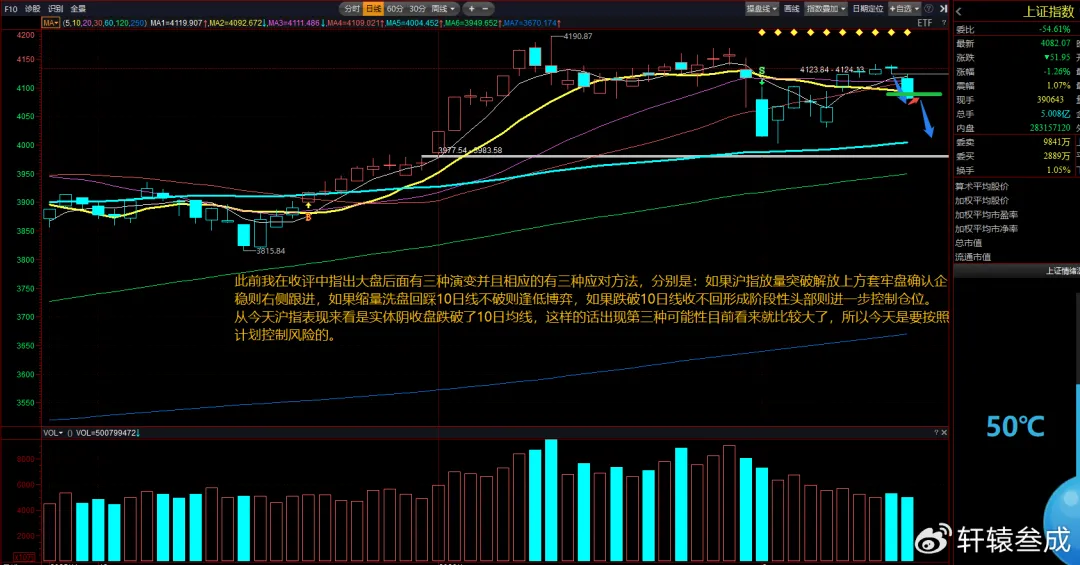 从K线形态上分析,此前轩辕在复盘文章中指出大盘后面有三种演变并且相应的有三种应对方法,分别是:如果沪指放量突破解放上方套牢盘确认企稳则右侧跟进,如果缩量洗盘回踩10日线不破则逢低博弈,如果跌破10日线收不回形成阶段性头部则进一步控制仓位。
