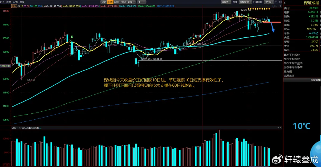 深成指和创业板指数,轩辕昨天说过盘中的高开分时缺口并未回补留下隐患,并且分时图黄白两线走剪刀差后是要当心的,不要被指数虚假的阳线所迷惑。今天就直接把昨天的阳线还回去了,并且还在尾盘完全回补了昨天的分时缺口,形态上也走出阴包阳。深成指今天收盘价正好回踩10日线,节后观察10日线支撑有效性了,撑不住则下面可以看得见的技术支撑在60日线附近。