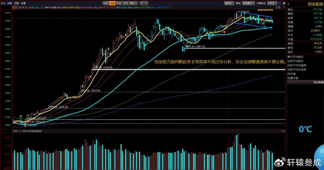 创业板方面判断起来非常简单,不用轩辕过多分析,没走出调整通道就不算企稳。