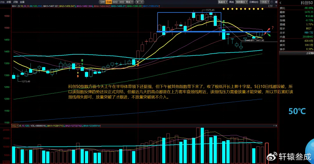 科创50指数方面,今天上午在半导体带领下还挺强,但下午被其他指数带下来了,收了根低开长上影十字星。5日10日线都没破,所以该指数反弹趋势还没正式完结,但最近几天的高点都是在上方套牢盘颈线附近,该颈线压力需要放量才能突破,所以节后紧盯该颈线得失即可,放量突破了才跟进,不放量突破就不介入。