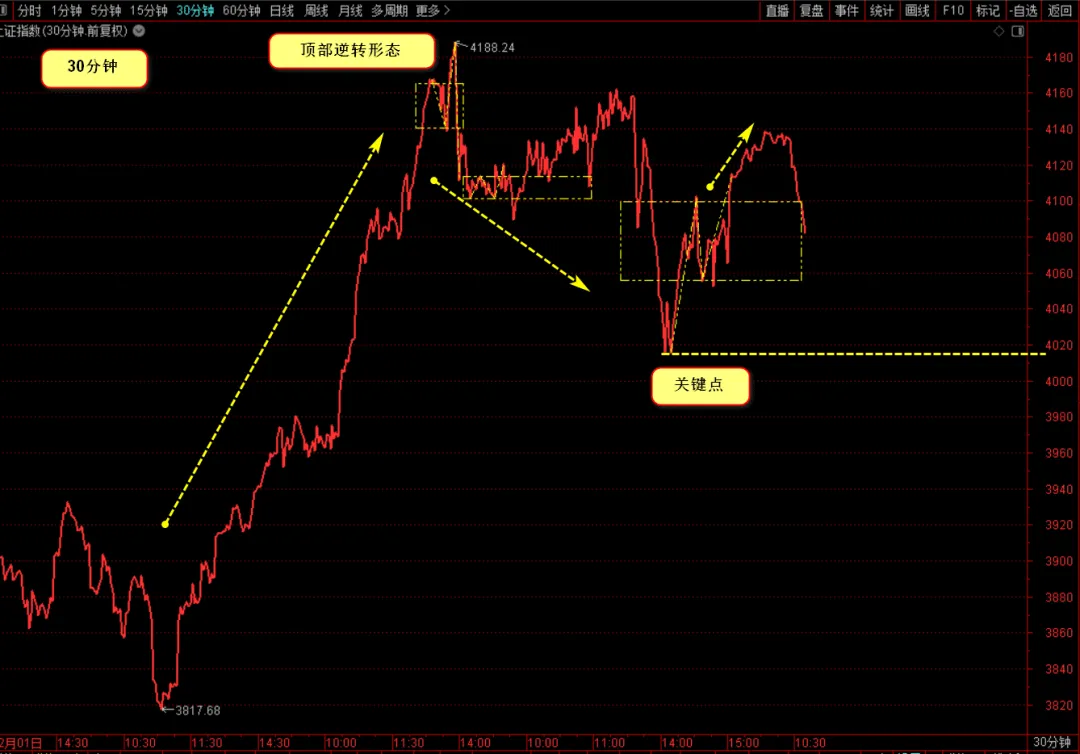 30分钟底部逆转形态后,在关键点位之上时,看多。