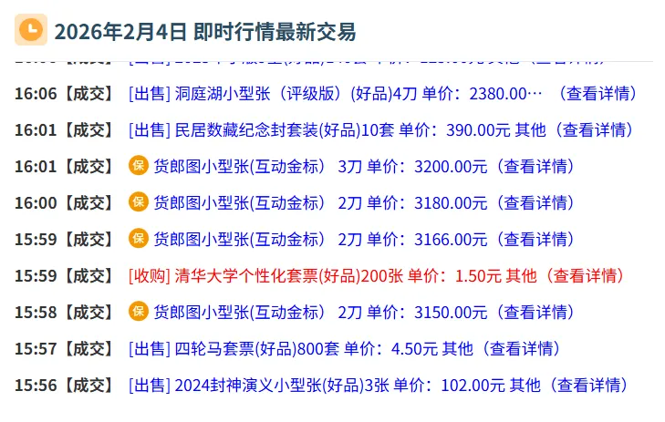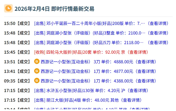 今日行情速递:互动金标《西游记》小型张强势领涨,单日涨幅高达 32.54%,上涨动能强劲。平台信用交易区与担保交易区交投活跃,成交顺畅,平台流动性持续改善,为春节前行情提供有力支撑。