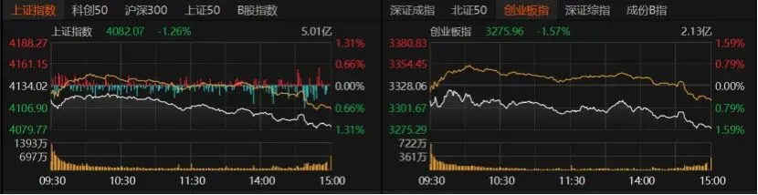 指数收跌居多,沪指收跌1.26%报4082.07点,创业板指收跌1.57%报3275.96点,深证成指收跌1.28%。科创50、北证50跌幅均不超过1%,但沪深300、上证50均跌逾1%。