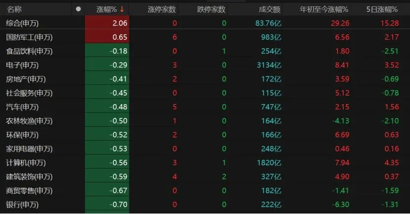 综合板块逆市涨逾2%,国防军工微红。食品饮料、电子、房地产、社会服务等板块微跌。
