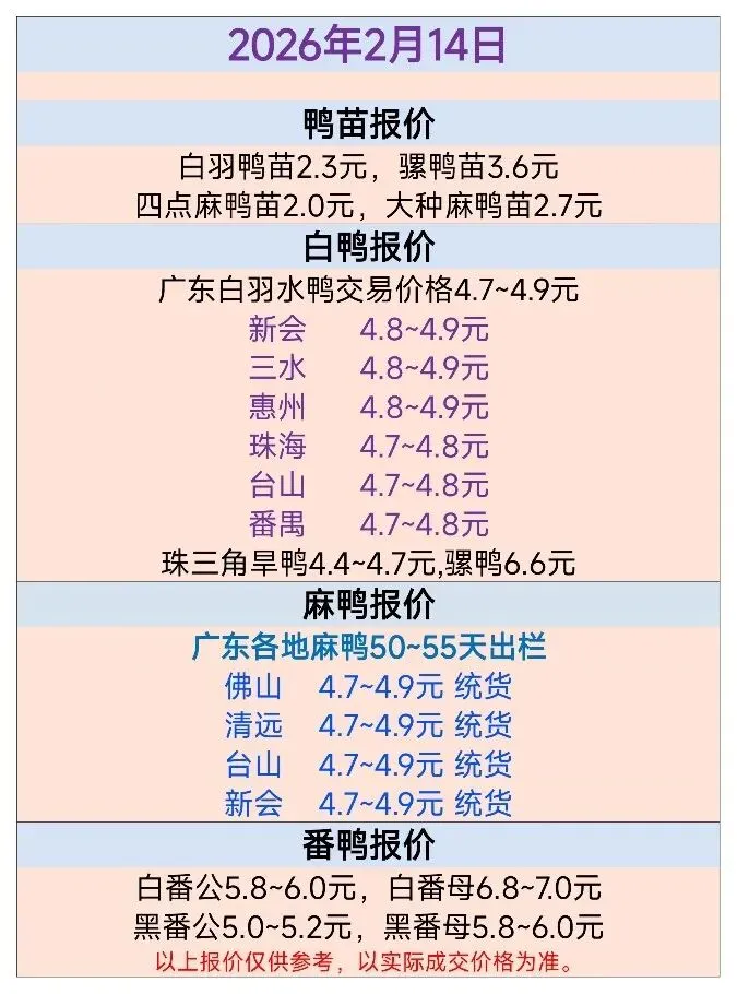 今日广东白羽水鸭价格上涨,报4.7~4.9元(7斤以上标准),旱鸭价格稳定,报4.4~4.7元;骡鸭价格稳定,报6.6元;麻鸭价格上涨,报4.7~4.9元;白番公鸭价格稳定,报5.8~6.0元;白番母鸭价格上涨,报6.8~7.0元;黑番公鸭价格稳定,报5.0~5.2元;黑番母鸭价格稳定,报5.8~6.0元。今日白鸭苗价格上涨,报2.3元;四点麻鸭苗价格上涨,报2.0元;大种麻鸭苗价格稳定,报2.7元;骡鸭苗价格上涨,报3.6元。广东大种白番公苗报4.6~5.1元, 大种白番母苗报5.6~6.1元;广东大花黑番公苗报4.1~4.5元, 大花黑番母苗报6.1~6.6元。