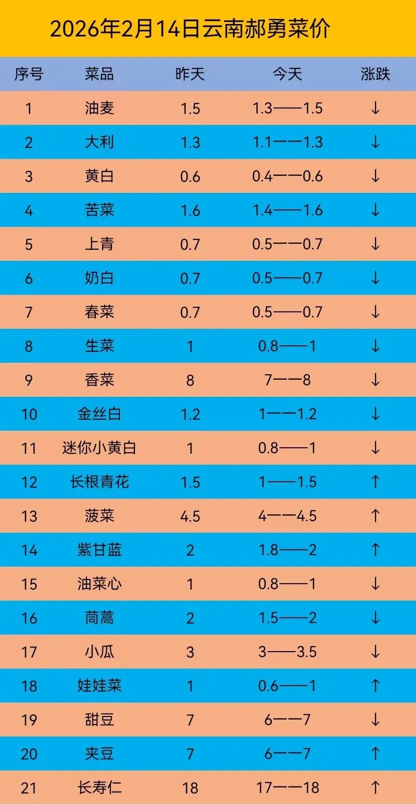 云南产区上货量还是很大,但是多数冷库已经放假,没有人买菜,估计要初五后才能恢复。现在各地跟风种植太厉害,各产区和各销区本地叶菜供应充足,市场消耗不了。预估后续行情平稳为主,变化不会太大。