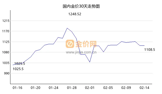 今日国内金价下跌,现价1108.50 元/克,下跌-1.47%,今日开盘价0.00,最高价0.00,最低价0.00。