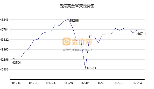 今日香港黄金上涨,现价46711 港币/两,今日开盘价45794,最高价46837,最低价45352。