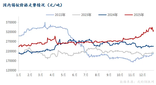 原料锡锭:作为镀锡板生产原料中最重要组成部分,全年价格震荡上行,2025年均价273689元/吨,同比涨幅10.31%。从趋势看,价格水平延续2024年上涨趋势且全年维持高位震荡,整体在24-34万波动。据Mysteel测算,生产每吨马口铁以0.2mm双面2.8g耗锡平均成本约1006.18元/吨钢,同比锡锭成本增加94.04元/吨钢。