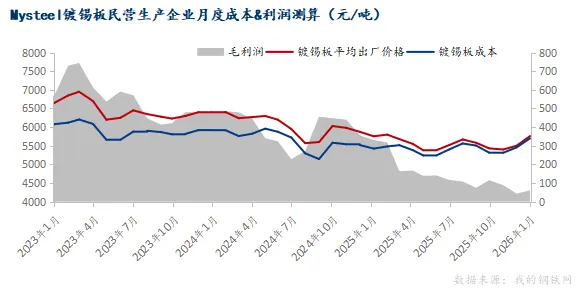 Mysteel对民营企业成本&利润测算数据显示:2025年1-12月份镀锡板生产平均成本5403.21元/吨,同比下滑268.25元/吨;平均毛利150.54元/吨,同比下滑245.92元/吨,全流程企业整体利润尚可。从利润和成本数据看,全年马口铁毛利震荡运行,生产利润明显下滑,主要受基础原料价格波动影响,且企业间同质化竞争激烈。