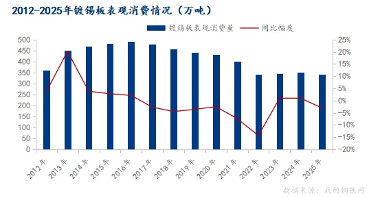马口铁应用领域大类可分为食品级包装和非食品级包装,食品级包装中包括饮料罐、食品罐头、奶粉罐等,非食品级包装包括化工罐(桶)、喷雾罐、电子配件行业等,行业产量状况直接反映了马口铁需求是否良好。2025年下游产量看,饮料行业在2024年高速增长后呈现回落,罐头、乳制品行业继续呈现下跌趋势,受相关政策影响,酒行业表现不及预期。从马口铁供需数据看,2024年马口铁表观消费量在350.9万吨,2025年表观消费约340.21万吨,同比下滑3.05%,马口铁供应增量对应也是马口铁直接出口增量,一定程度上缓解内贸下滑压力。