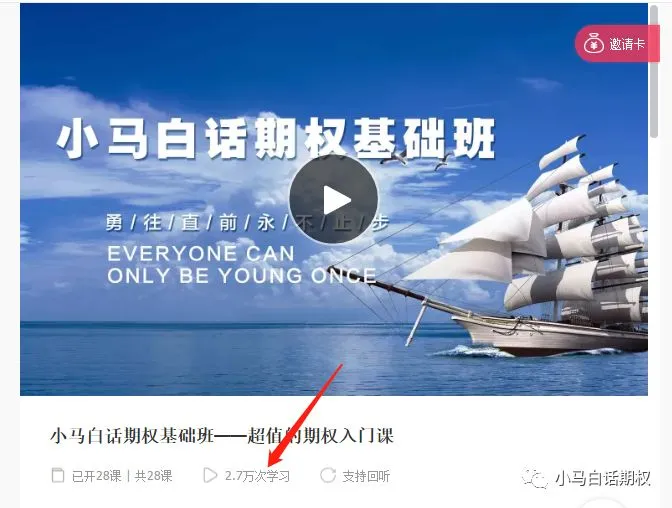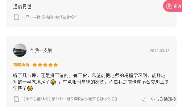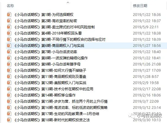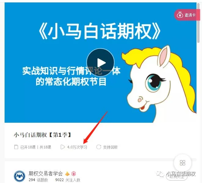 一个期权小白从懵懂初学到思路通透,需要经过大量的思考与实践,孤独求索的过程是比较痛苦的,往往花费大量的时间也不一定走到豁然开朗的高台。多聚会多参加会议活动对大家的成长很有好处,这本质上是快速吸收了别人的思考成果。如果你看到哪个高手愿意分享,那你找机会多请他吃饭。如果你知道哪位写了期权书的作者原意进一步分享,那你也要多请他吃饭,一顿饭可能两百块钱,但可能解决你很多困扰。问题是高手们往往饭局都很满,也有可能根本不在一个城市,那么机会来啦。期权交易者学会推出了全国第一档陪伴式的期权视频节目《小马白话期权视频版系列》,该视频自成体系,与书相呼应,但信息量比书要大很多,再次正式推荐给大家!每一季的价格只需要一顿饭钱。